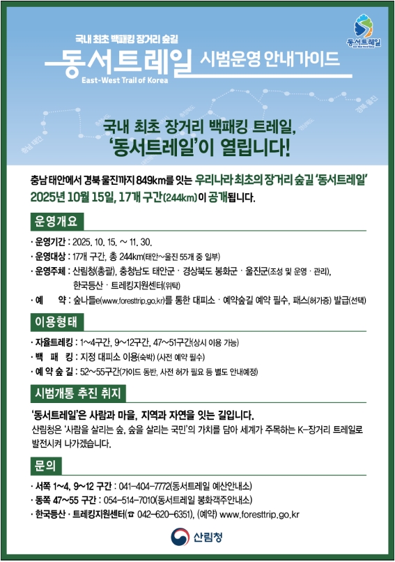 동서트레일(East–West Trail)은 충남 태안군에서 경북 울진군까지 이어지는 849km의 장거리 숲길입니다.