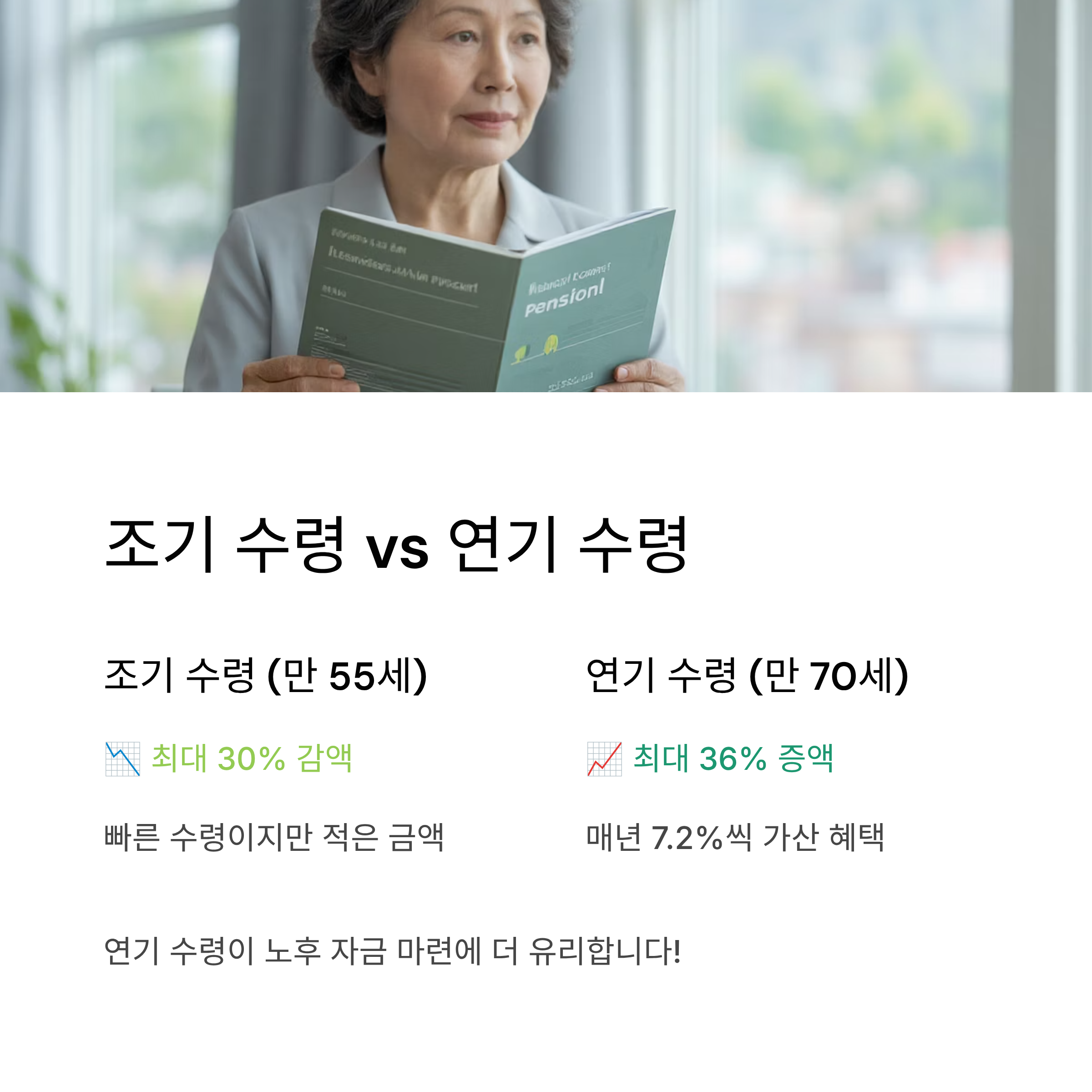 - 연기 수령: 만 65세 이후 최대 5년 연기 가능, 1년당 7.2%씩 가산되어 최대 36% 더 받을 수 있음