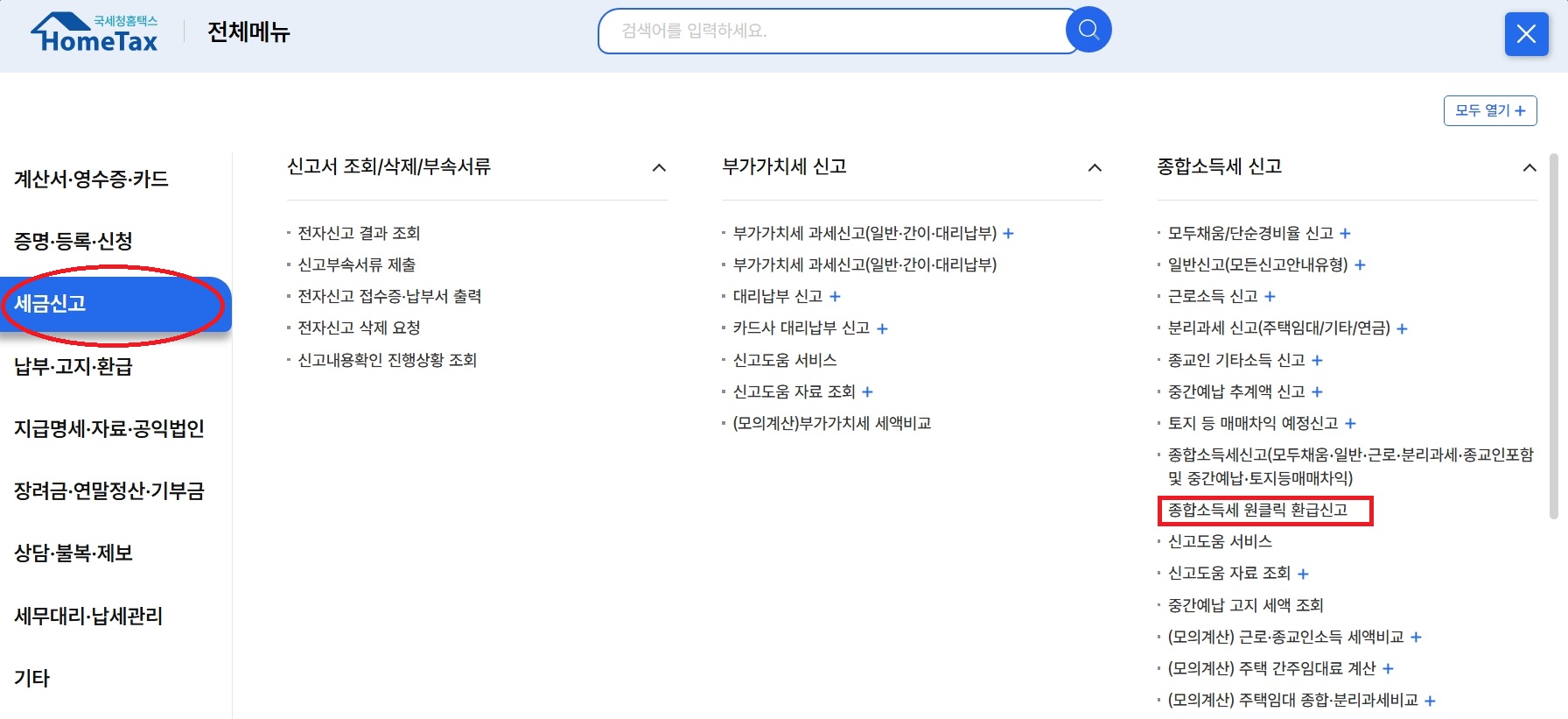 홈택스 → 세금신고 → 종합소득세 신고 → 종합소득세 원클릭 환급신고