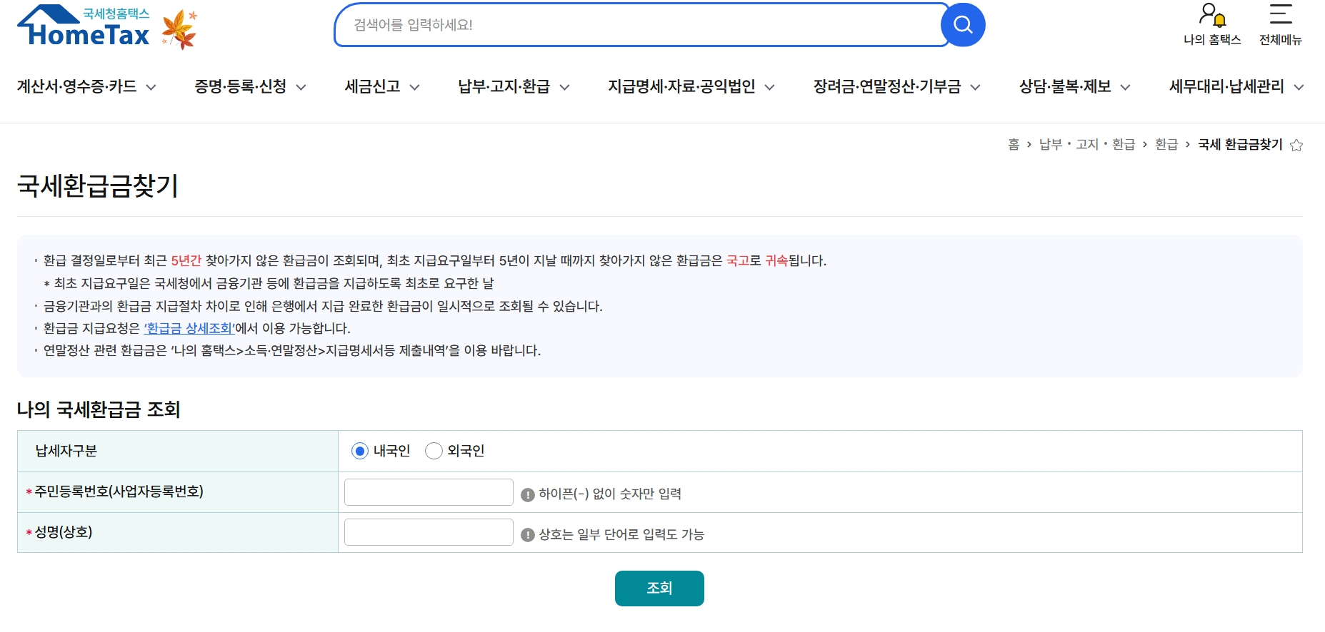여기서는 주민등록번호와 이름만 입력해도 과거 5년간 미수령 환급금을 한 번에 확인할 수 있습니다.