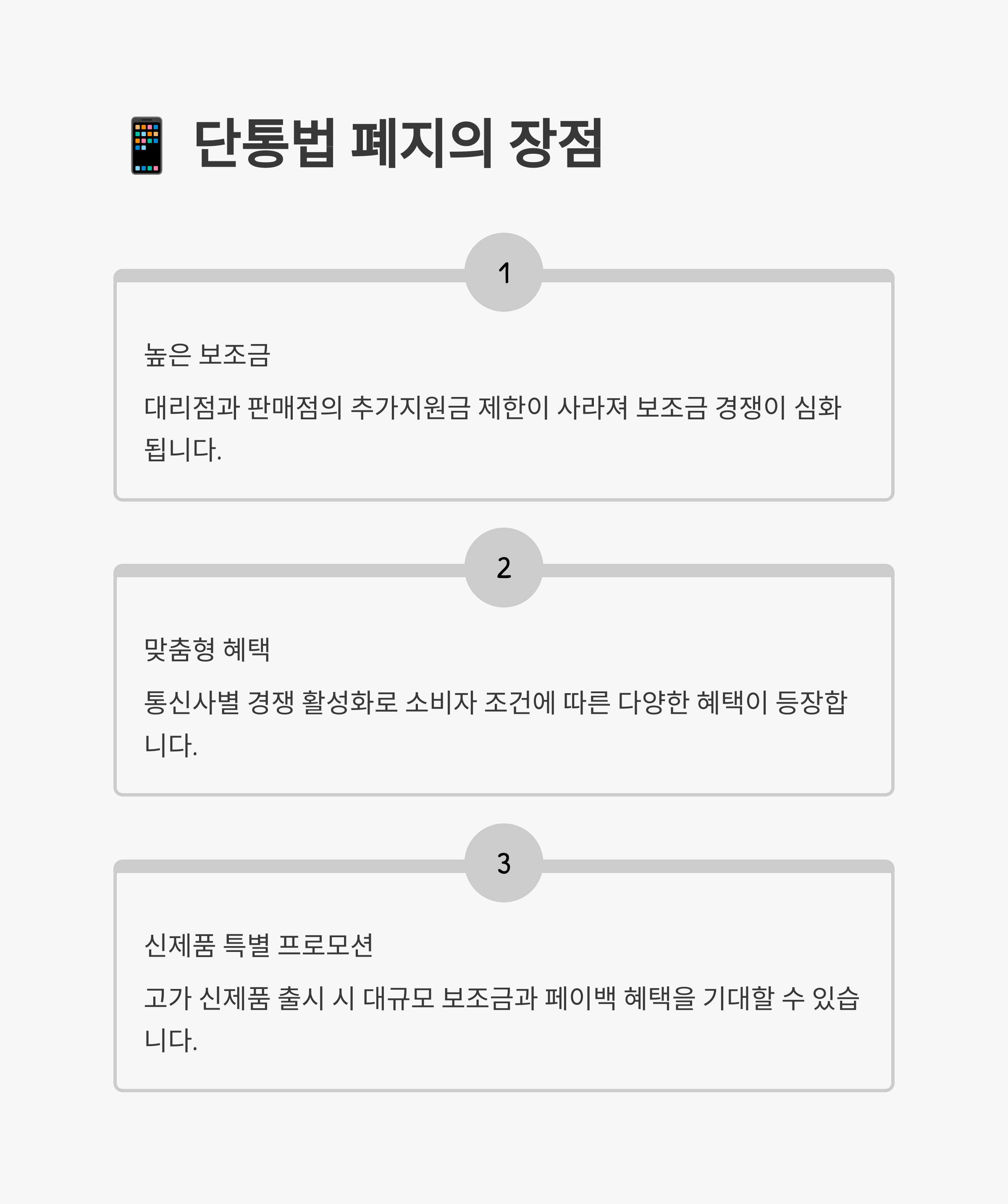 - 보조금 경쟁 재점화 → 통신사와 유통점이 자율적으로 보조금을 책정하면서 더 높은 보조금을 받을 가능성이 높습니다. '0원폰', '마이너스폰'도 등장할 수 있습니다.