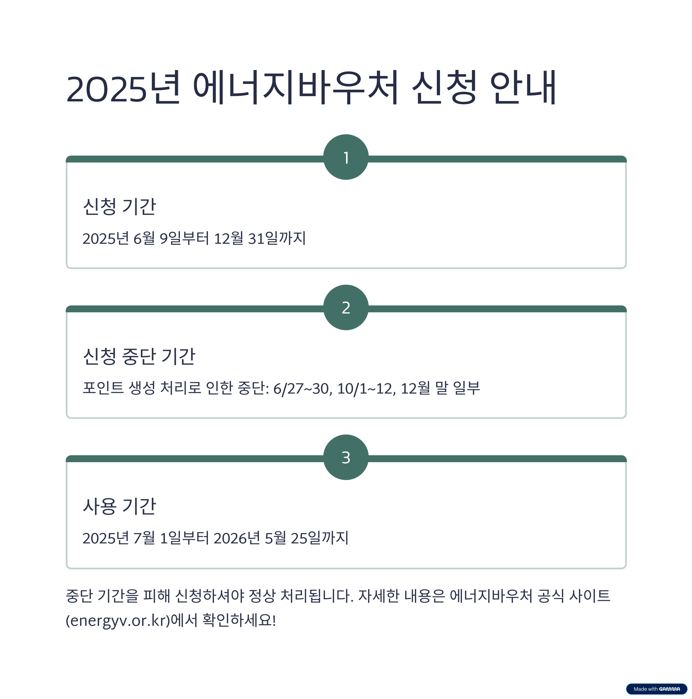 에너지바우처의 2025년도 신청 기간은 2025년 6월 9일(월)부터 12월 31일(수)까지입니다. (energyv.or.kr 참고)