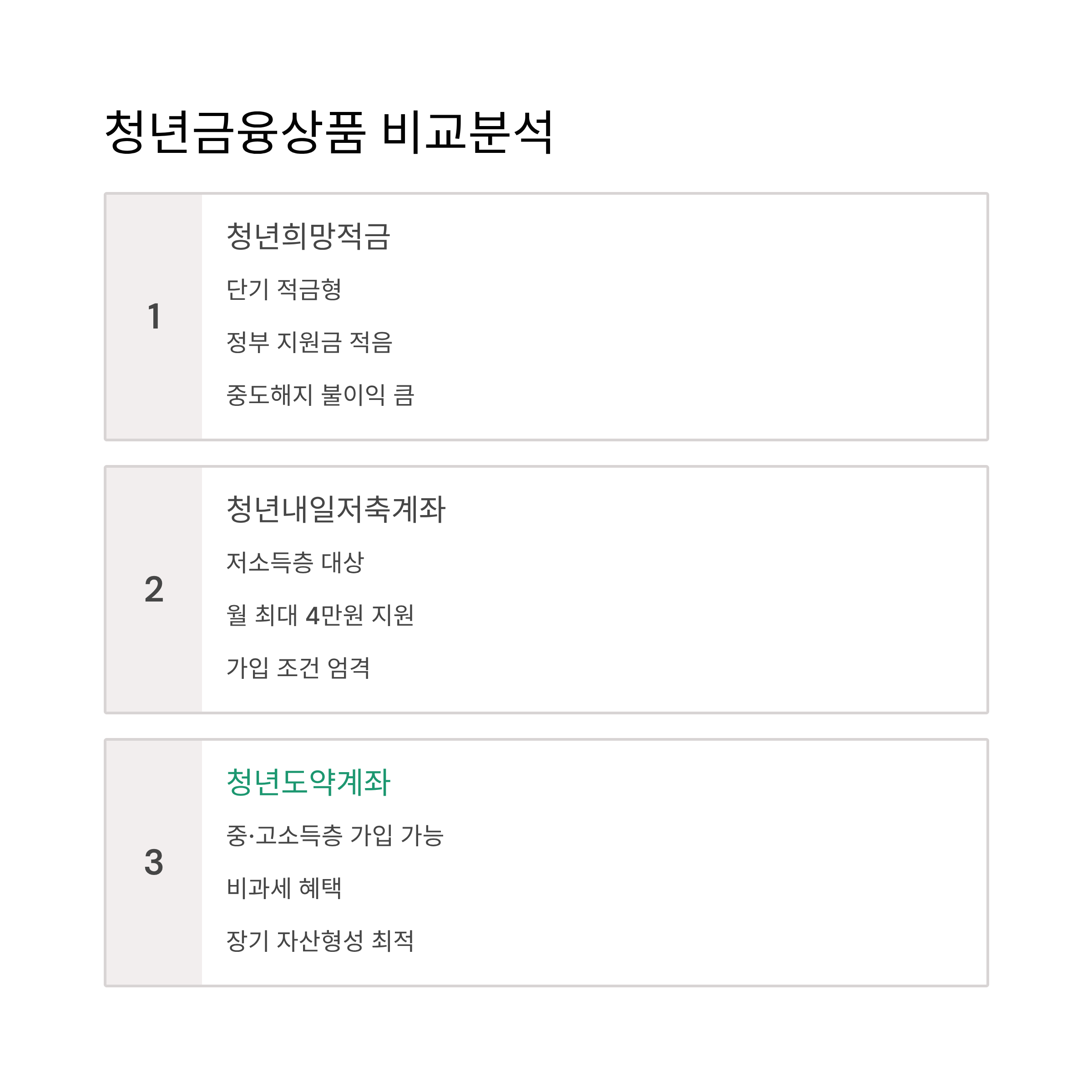 - 청년도약계좌: 5년 만기, 장기 자산 형성 중심