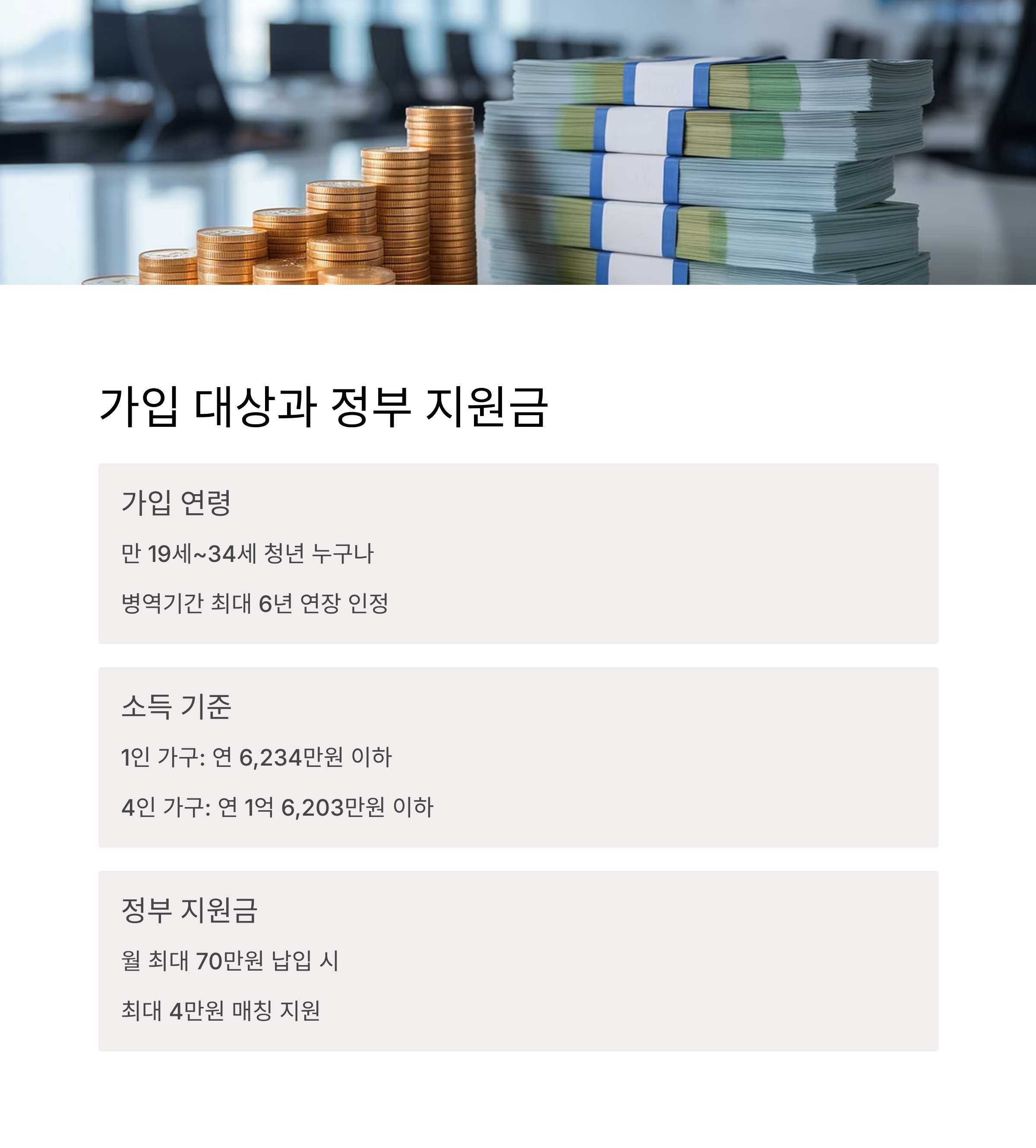 - 정부 보조금 지원 → 소득 구간에 따라 월 최대 4만 원 추가 적립