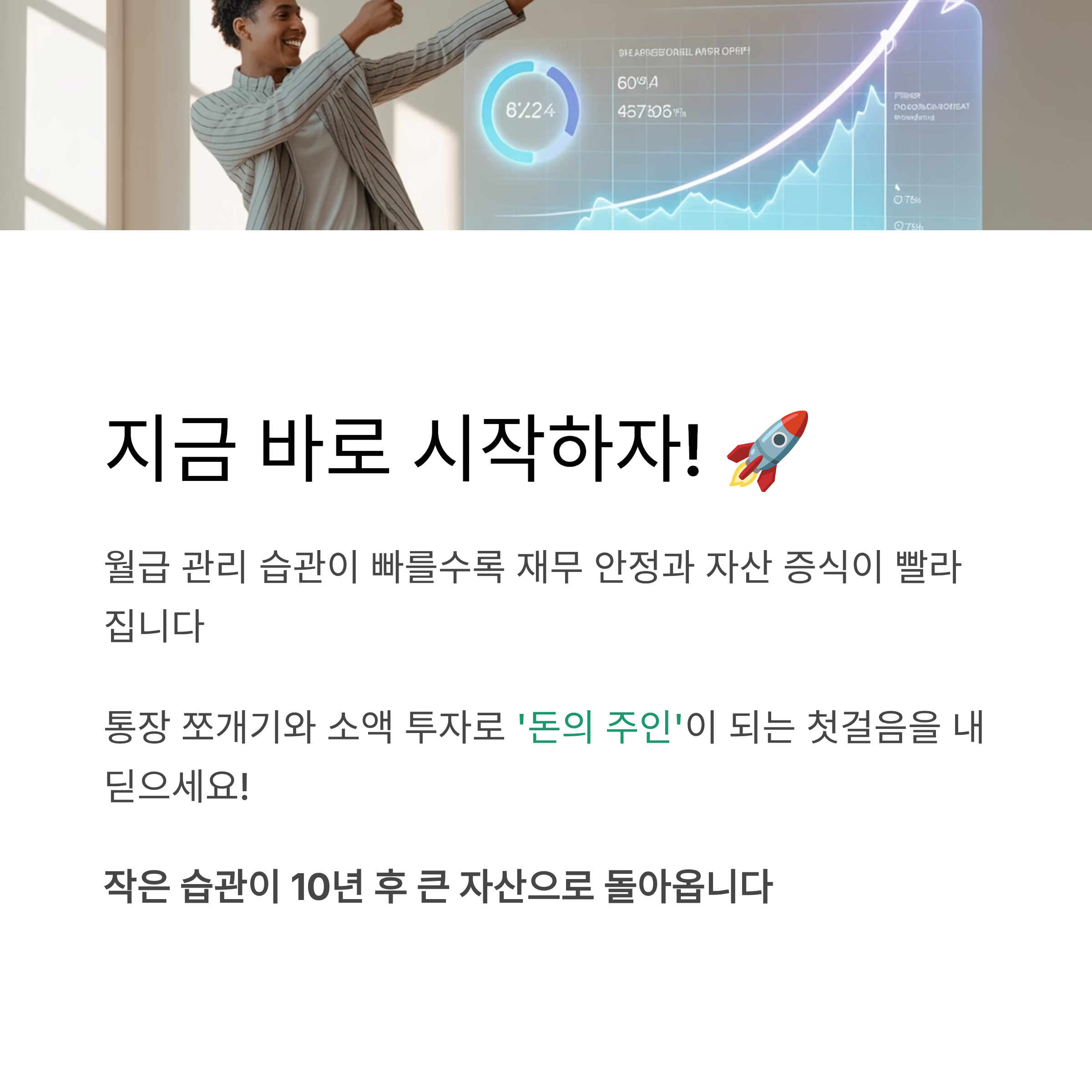 - 지출은 고정비부터 관리: 월세, 통신비, 교통비 등 매달 나가는 비용을 먼저 점검