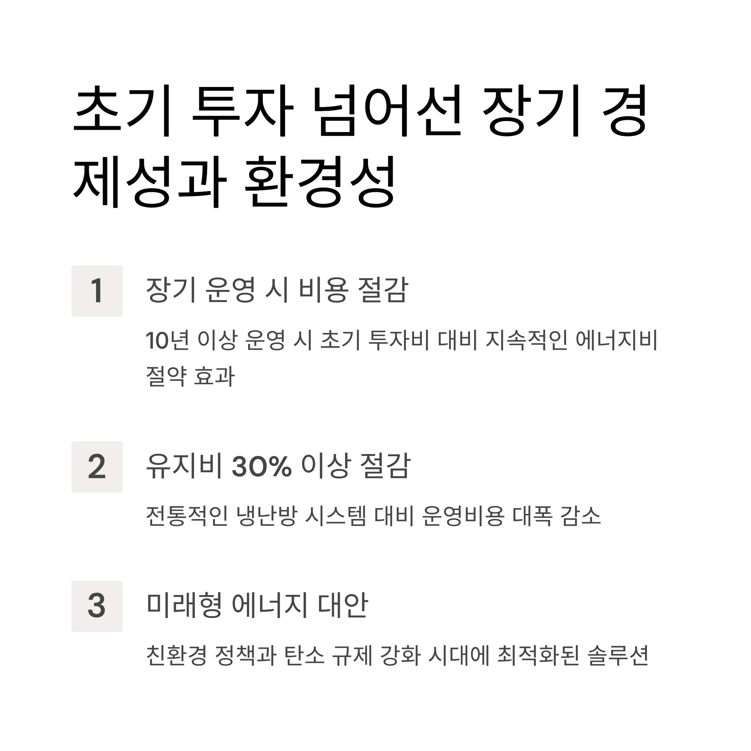- ② 에너지 절감 – 기존 전기·가스 대비 최대 30~50% 에너지 비용 절감 가능