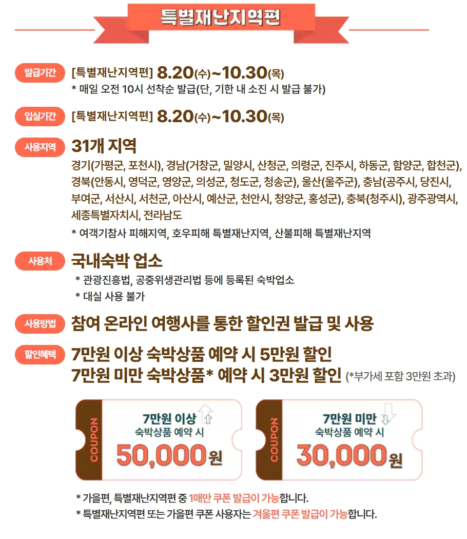 | 가을편 (1차) | 비수도권 지역 (서울·인천·경기 제외) | 80만 장 | 8.20 ~ 10.30 | 8.20 ~ 10.30 | 7만원 이상: 3만원 7만원 미만: 2만원 |