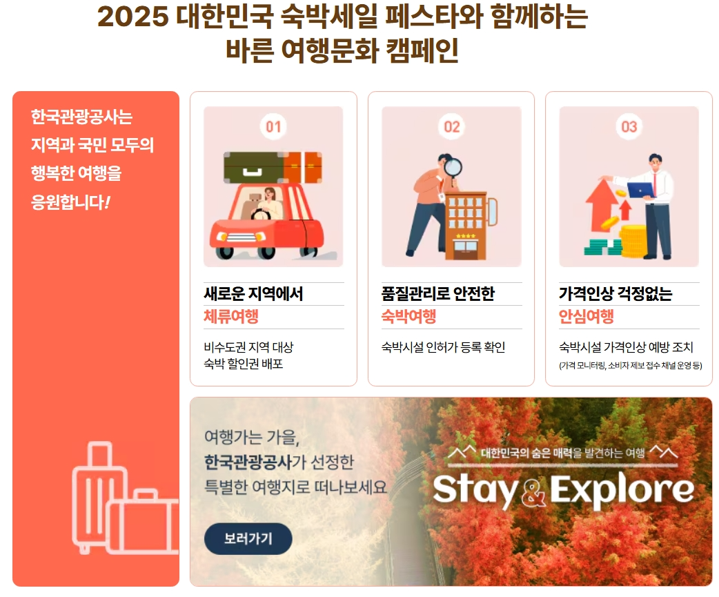 여행의 계절, 가을과 겨울을 맞아 문화체육관광부(문체부)와 한국관광공사가 함께하는 대규모 국내여행 지원 이벤트, ‘숙박세일페스타 2025’가 돌아왔습니다! 이번 행사는 국민의 여행비 부담을 줄이고, 침체된 지역경제를 살리기 위한 전국 숙박할인 캠페인으로, 여행을 사랑하는 누구나 참여할 수 있습니다.