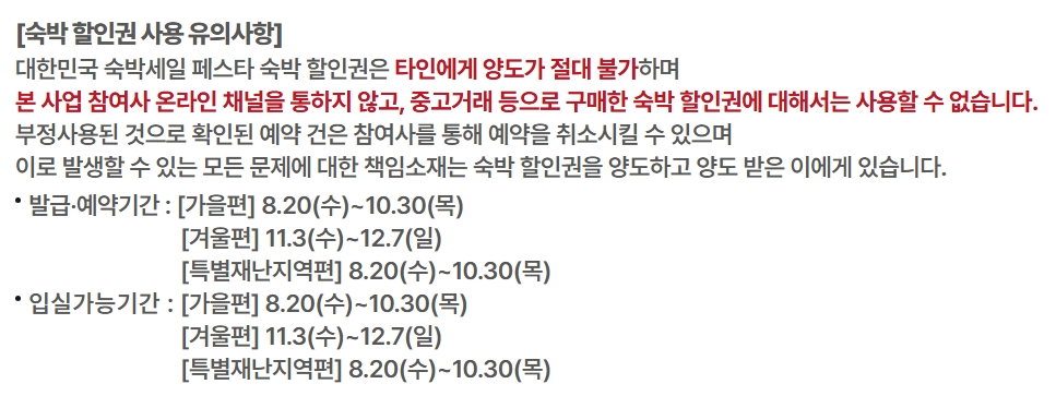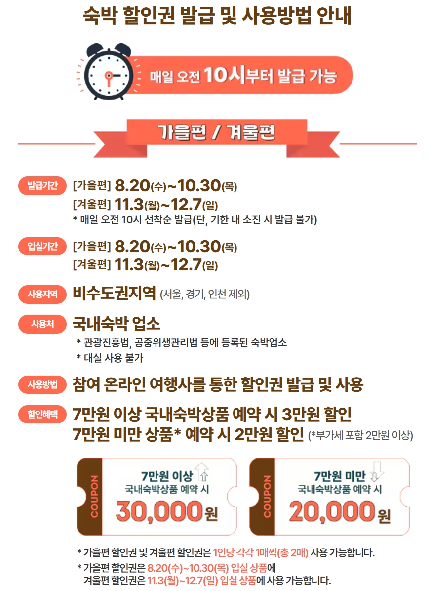 할인권은 호텔, 리조트, 펜션, 콘도 등 등록된 숙박시설에서만 사용할 수 있으며, 대실 상품은 제외됩니다. 또한 1인당 기간별 1매씩 최대 2회까지 사용할 수 있어 가을·겨울 여행 모두 참여 가능합니다.