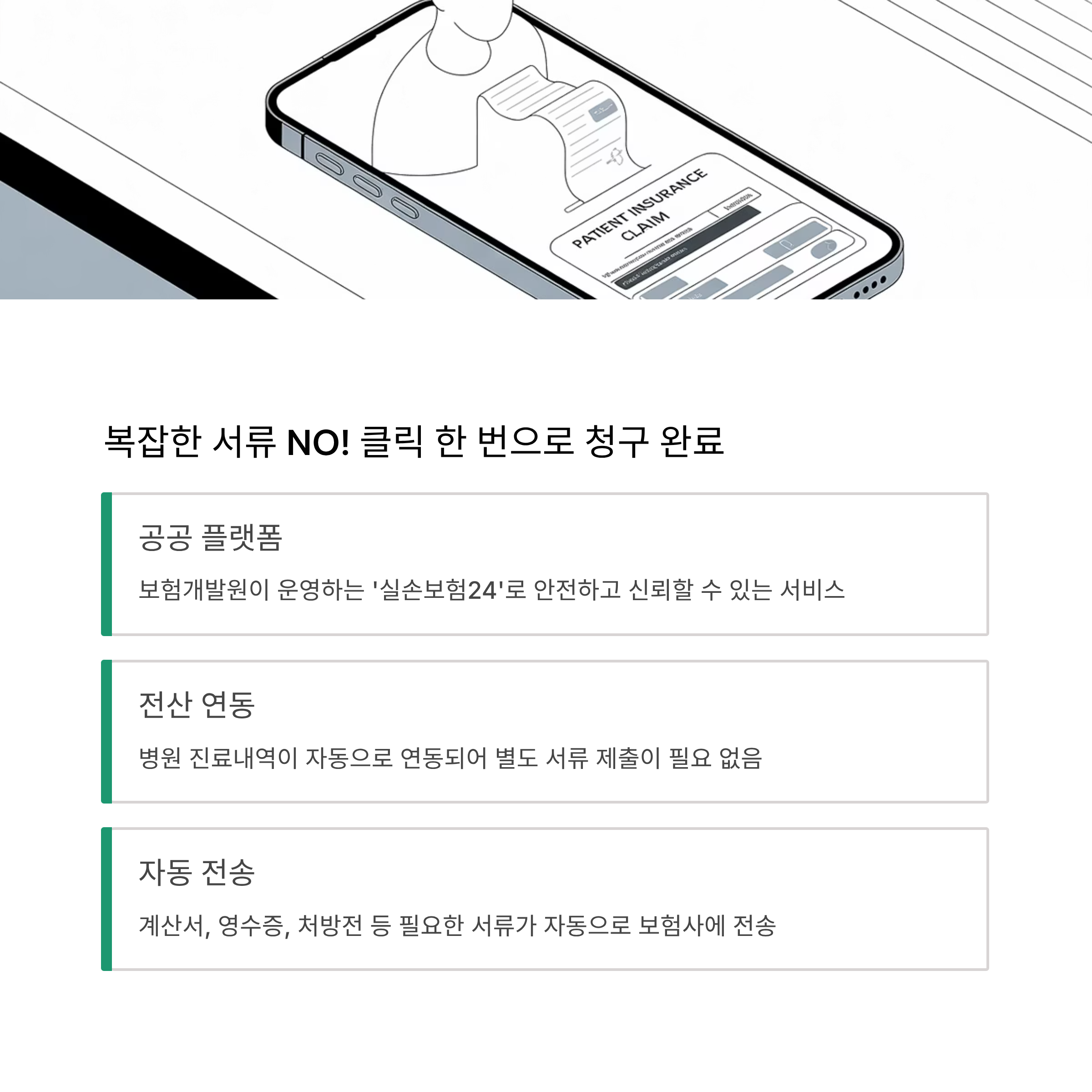 | 디지털 서류 전송 | 병원이 발행한 영수증, 진료비 내역서, 처방전 등을 전산으로 보험사에 자동 전송 |