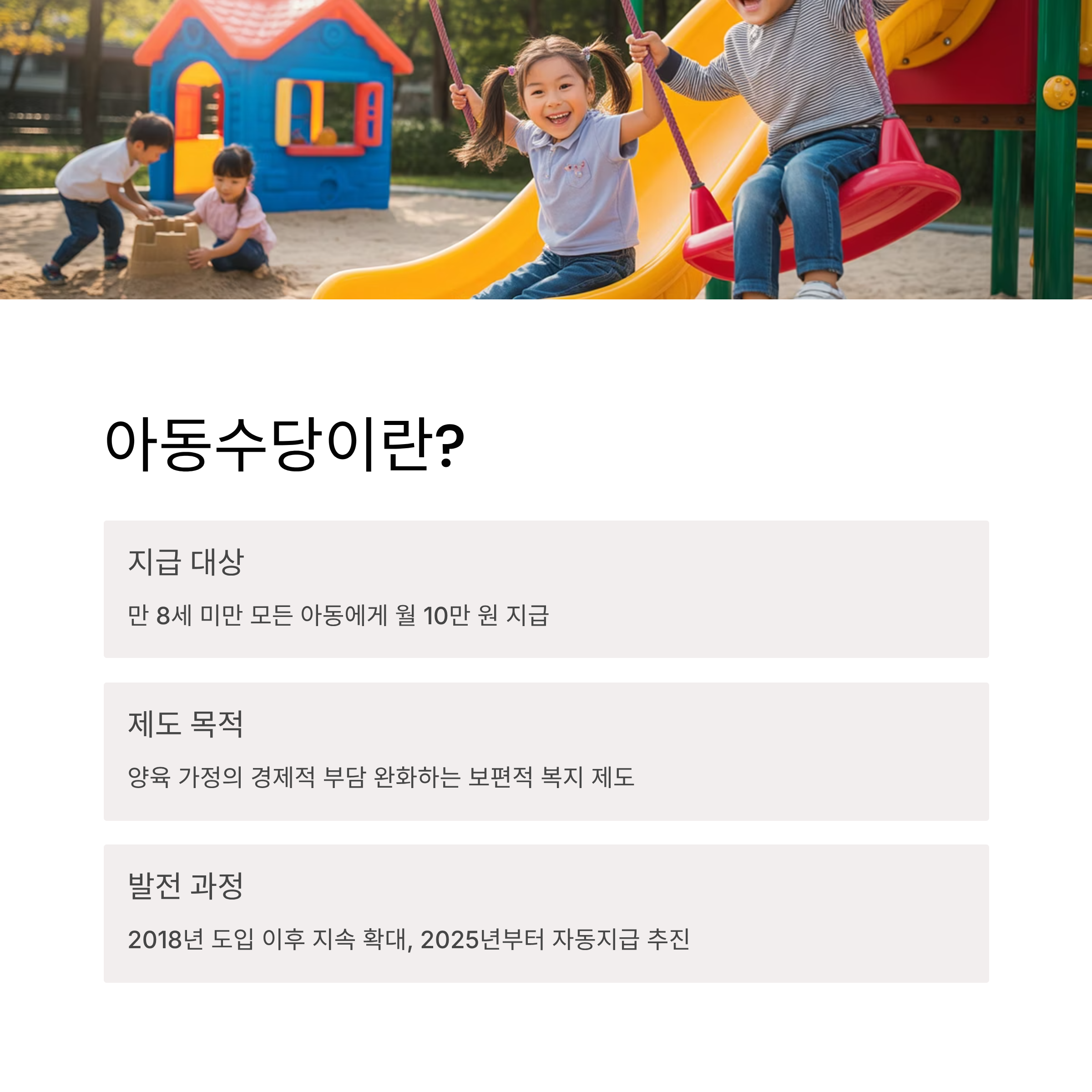• 목적: 아동의 복지 증진 및 양육 가정의 경제적 부담 완화 (보건복지부 정책 안내)
