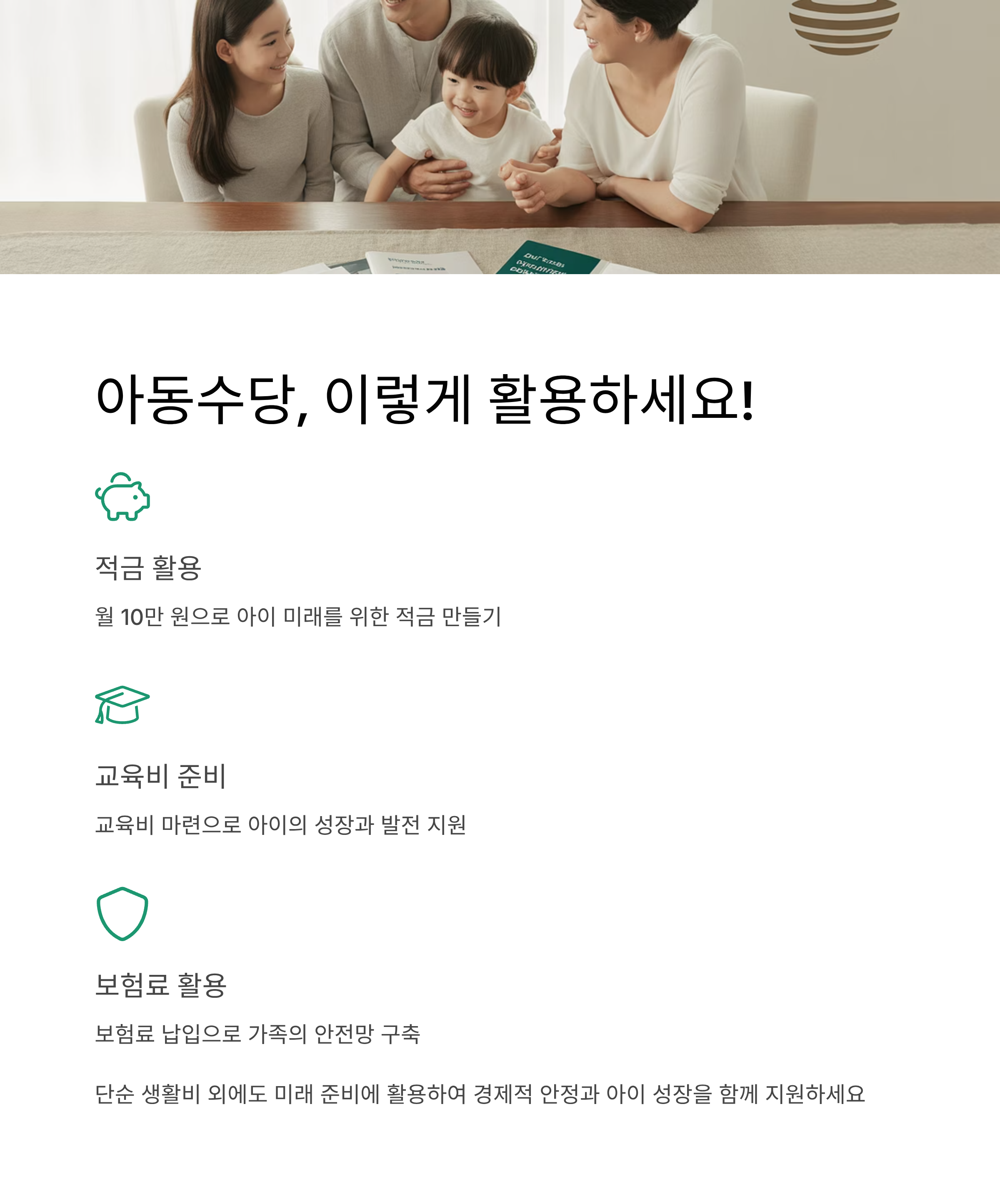 • 보험료 납입: 보장성 보험료에 활용해 아동 건강·안전 대비.