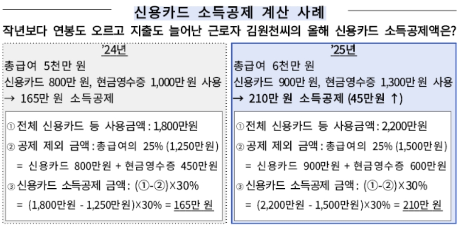 예를 들어 작년보다 연봉과 지출이 모두 늘어난 김원천 씨(가상 인물)의 사례를 통해 신용카드 공제액을 쉽게 확인할 수 있습니다