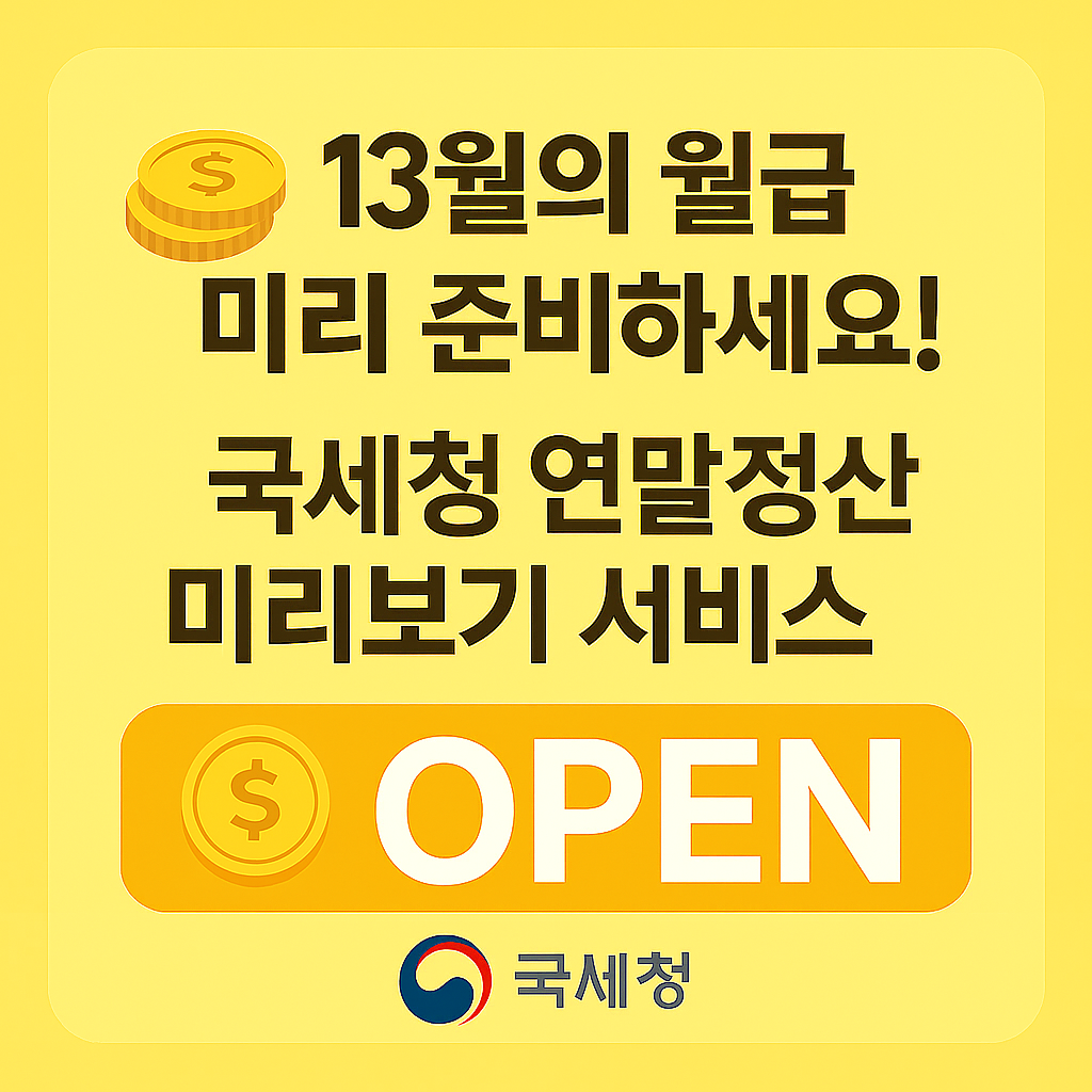 국세청(청장 임광현)은 근로자 약 2,000만 명이 기대하는 ‘13월의 월급’을 위해 ‘연말정산 미리보기 서비스’를 11월 5일(수) 홈택스에서 개통했습니다. 또한, 주요 공제·감면 항목별 맞춤형 안내 서비스도 11월 6일부터 2026년 1월 31일까지 제공됩니다