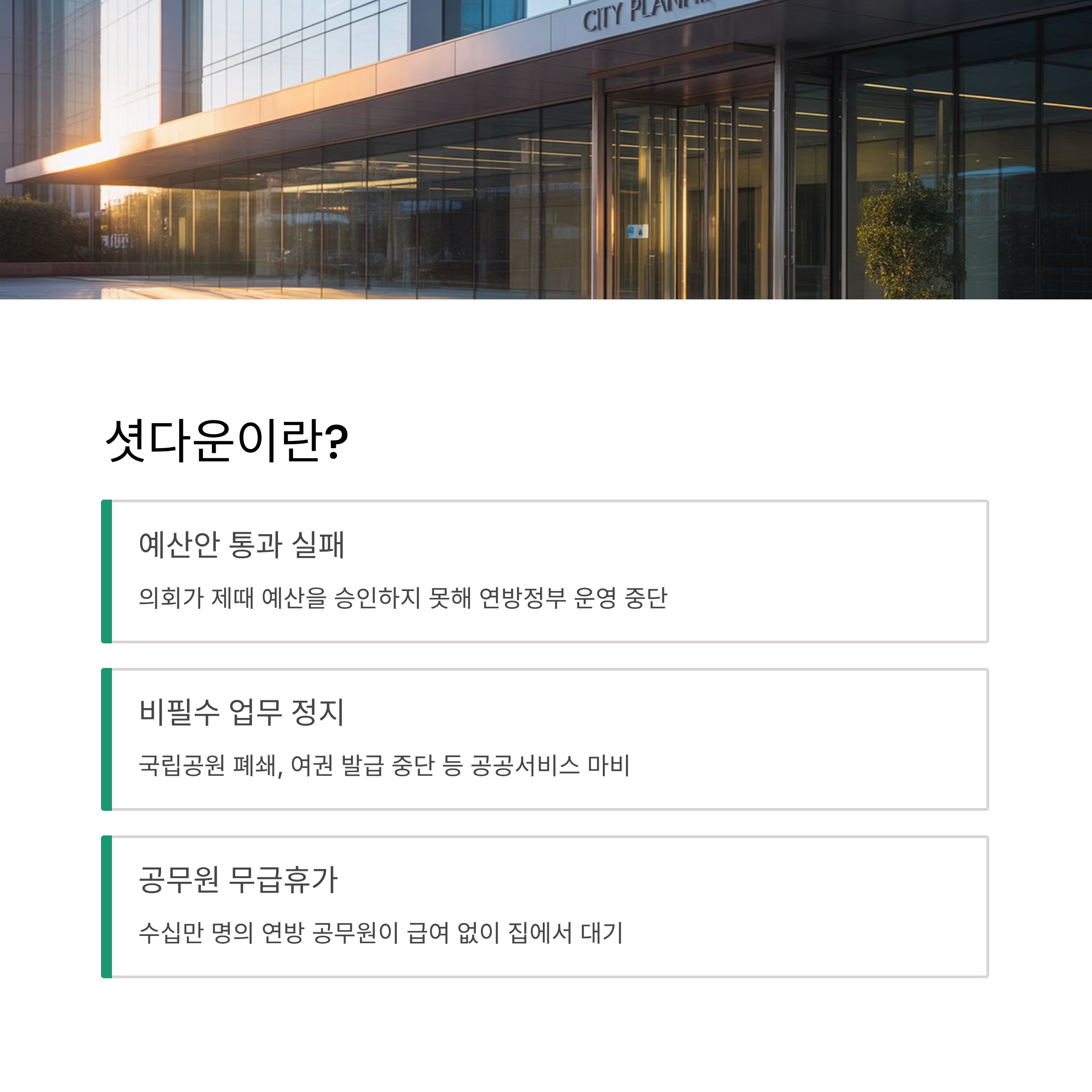 즉, 셧다운은 단순한 행정 지연이 아니라 정치적 갈등이 행정 시스템을 멈추게 하는 위기 상황입니다. “정부가 문을 닫는다”라는 표현 그대로, 비필수적인 정부 서비스가 정지됩니다.