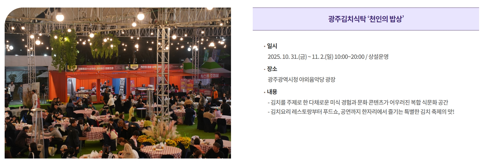 10월 31일(금) ~ 11월 2일(일)|광주광역시청 일원|안유성 명장 요리쇼·천인의 밥상·K-김치파티·김치마켓·팔도 김치·대통령상 김치 전시·체험·마스터클래스·차 없는 거리