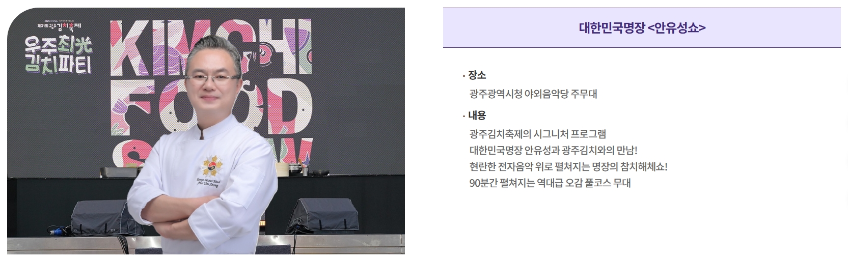 넷플릭스 "흑백요리사"로 잘 알려진 안유성 명장이 광주김치를 주재료로 명장의 칼·명장의 김칫독·명장의 식탁을 주제로 라이브 쇼를 펼칩니다.