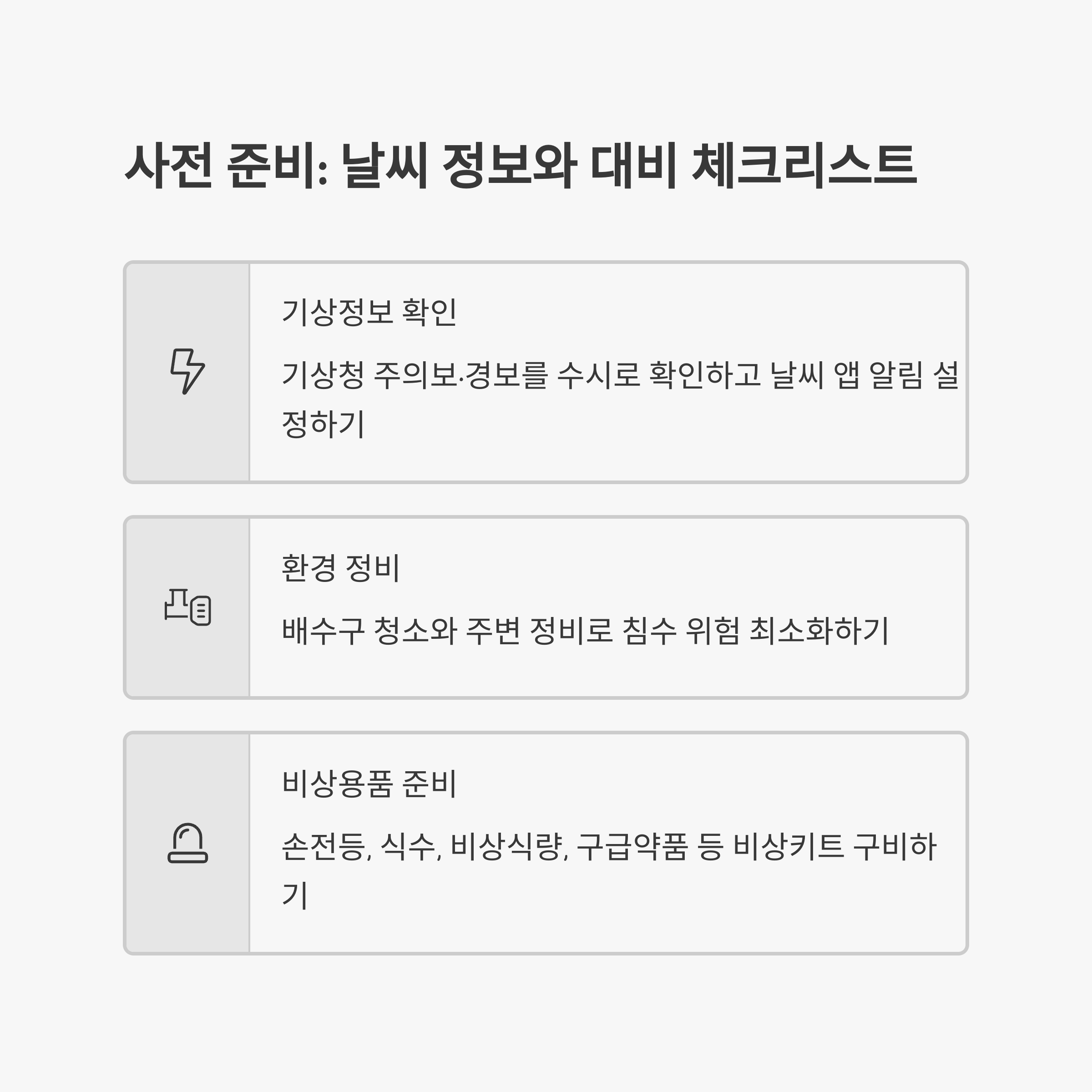 - 주변 위험 요소(배수구, 빗물받이, 지붕, 전선 등)를 주기적으로 점검하기