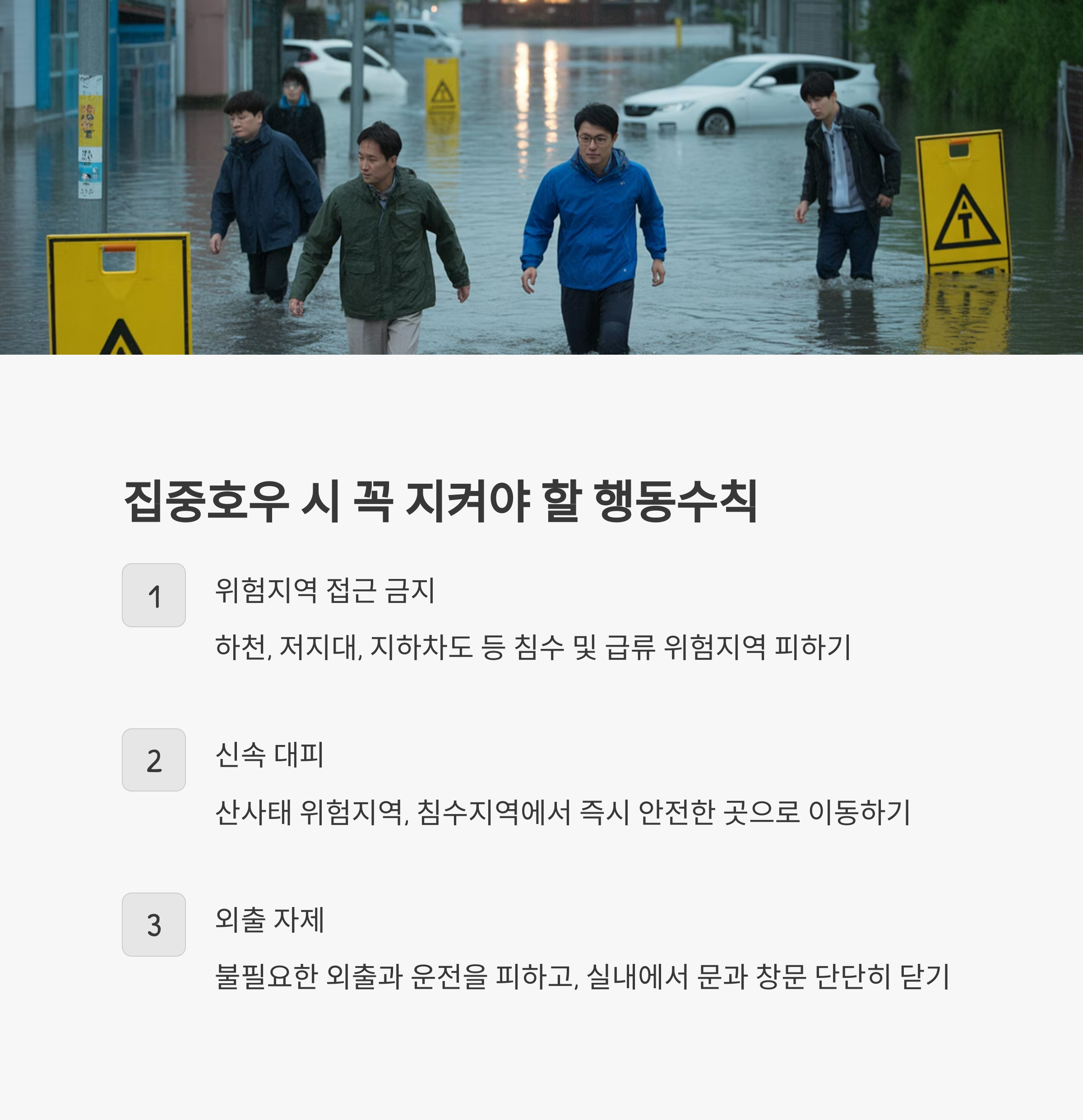 - 침수된 도로나 지하차도, 지하상가는 보행과 운전 모두 위험합니다. 반드시 우회하세요.