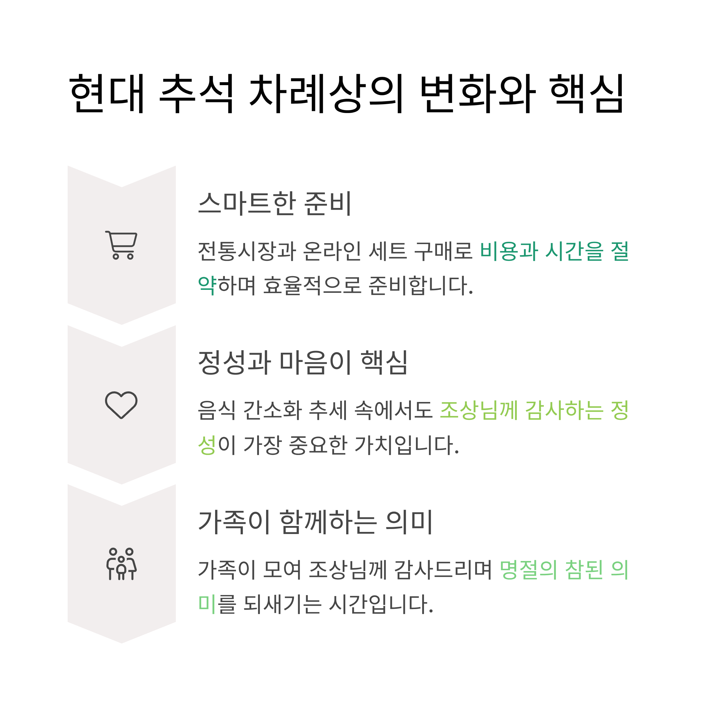 - 간소화: 필수 음식만 준비하고, 가족 합의 후 전·탕 종류 줄이기