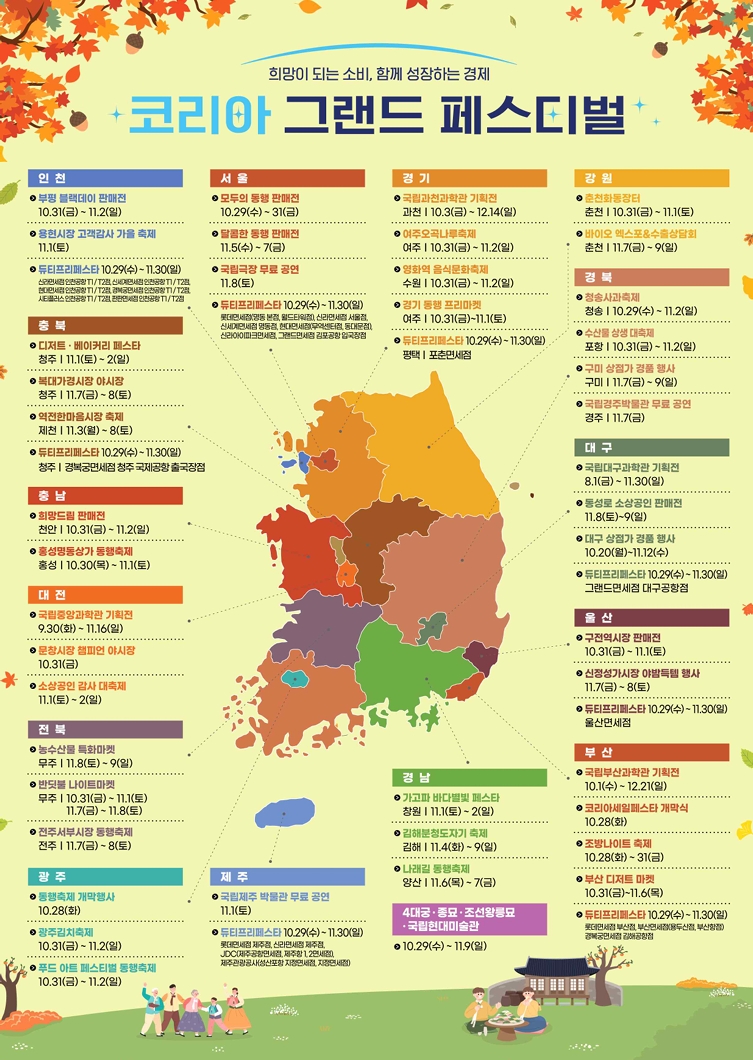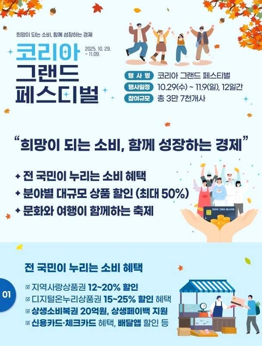 정부는 ‘희망이 되는 소비, 함께 성장하는 경제’라는 비전 아래 10월 29일(수)부터 11월 9일(일)까지 12일간 전국에서 「코리아 그랜드 페스티벌」을 개최합니다. 이번 행사는 국조실, 기재부, 문체부, 중기부 등 10개 부처가 협력해 진행하며, 전 국민이 체감할 수 있는 대규모 할인과 환급 혜택을 제공합니다.