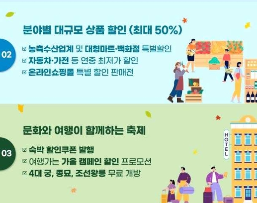 지방소비 활성화를 위해 지역몰과 관광업계도 함께합니다. 인천e몰, 산엔청쇼핑몰, e경남몰 등에서는 지역특산물 할인전을, 한화리조트·쏘카는 숙박·이동 할인 이벤트를 진행합니다.
