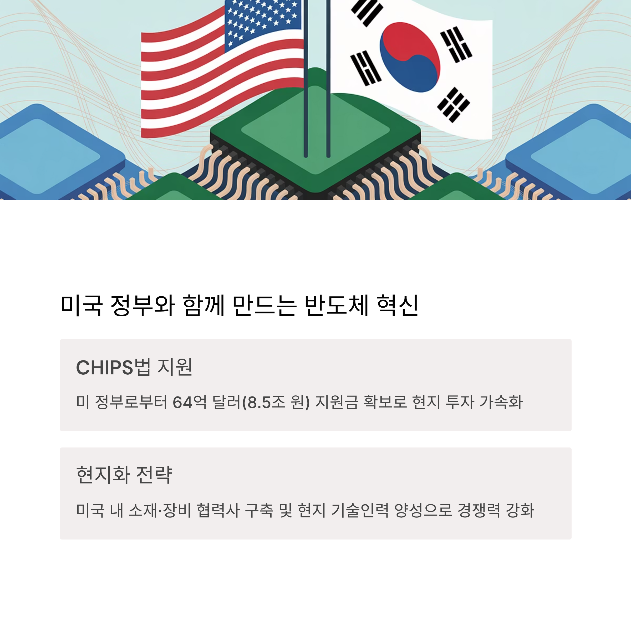- 정책 활용: CHIPS법 및 각종 인센티브로 재정적 안정 확보