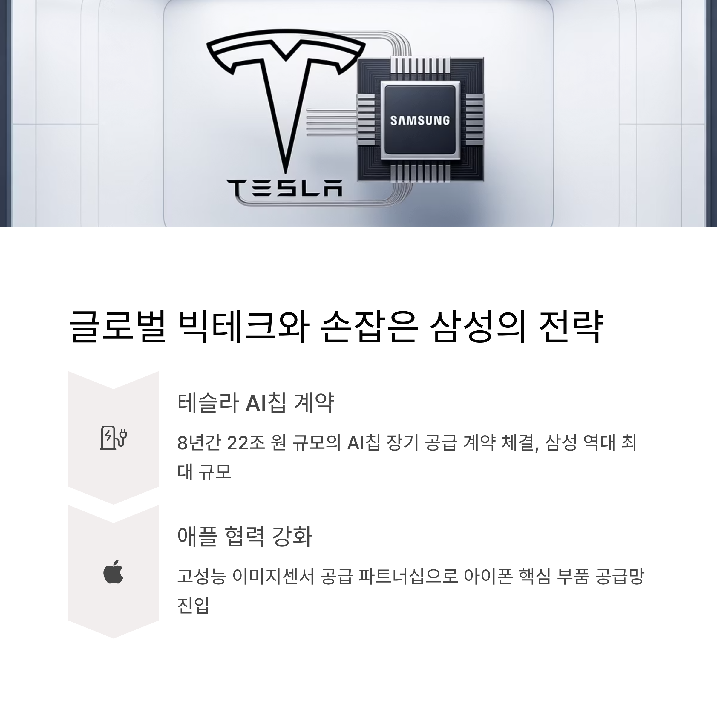 삼성은 최근 테슬라와 약 165억 달러 규모의 AI 칩 계약을 체결했습니다. 이 칩은 테슬라의 자율주행 차량과 AI 인프라에 필수적으로 사용될 예정입니다. 특히, 삼성의 텍사스 공장에서 해당 AI 칩을 생산하게 되며, 이는 글로벌 전기차 및 AI 시장에서 삼성이 입지를 확대하는 계기가 됩니다.