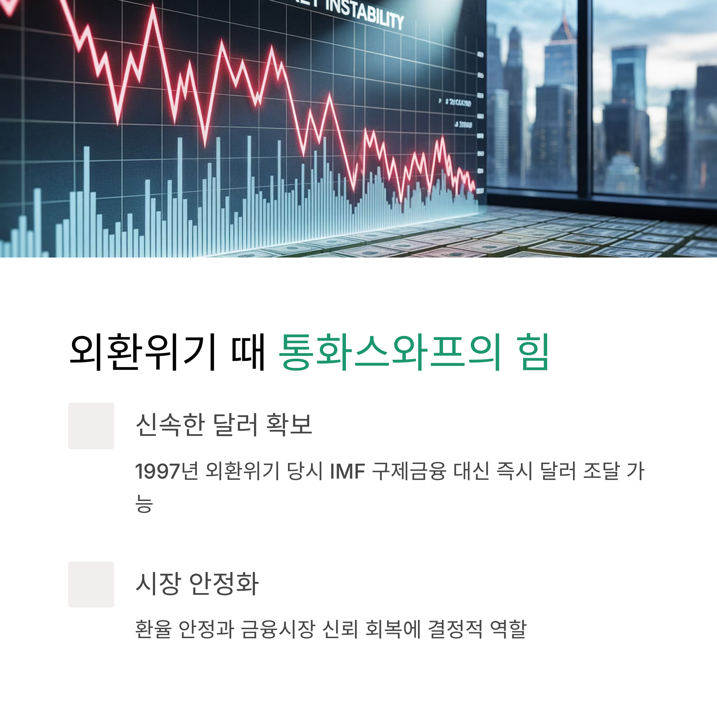 통화스와프는 단순히 외화를 빌려오는 계약을 넘어서, 금융시장 안정과 심리적 안전망 역할까지 합니다.