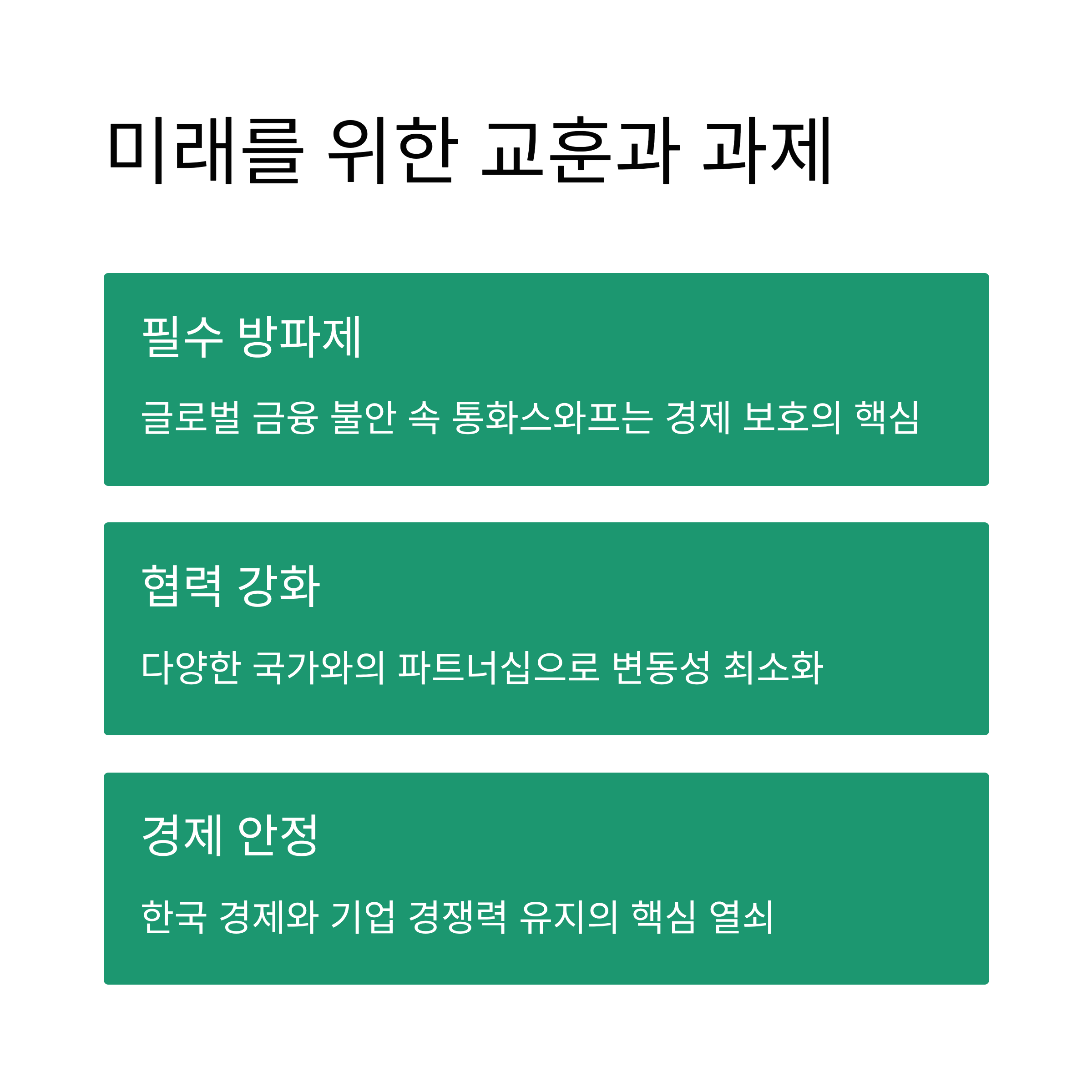 통화스와프는 환율 변동성을 억제하고 금융시장의 신뢰를 회복시키는 핵심 장치입니다. 한국은 2008년 금융위기와 2020년 코로나19 위기를 통해 한·미 통화스와프가 환율 안정에 얼마나 중요한지 경험했습니다.