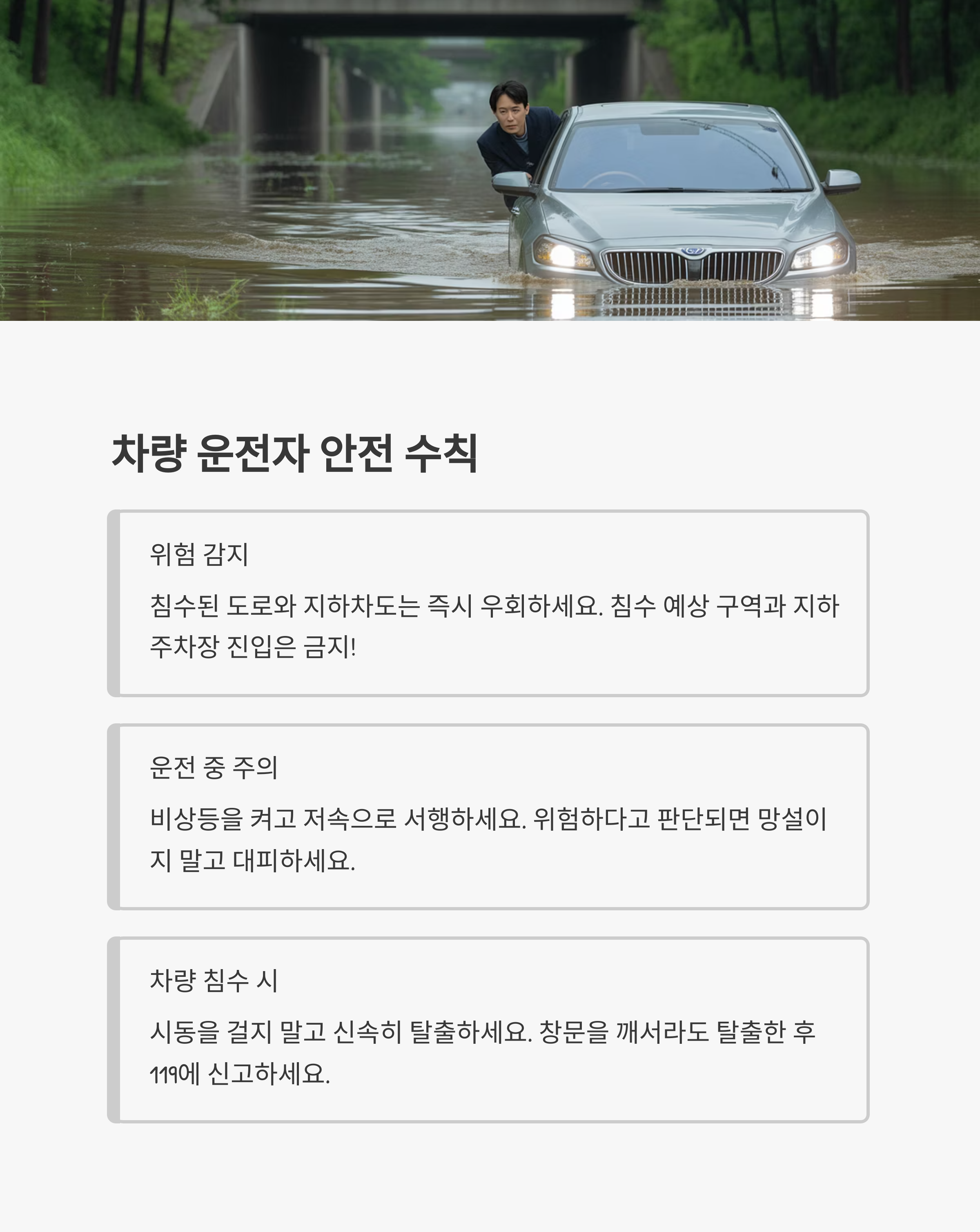 - 지하차도와 저지대는 진입하지 않는다.