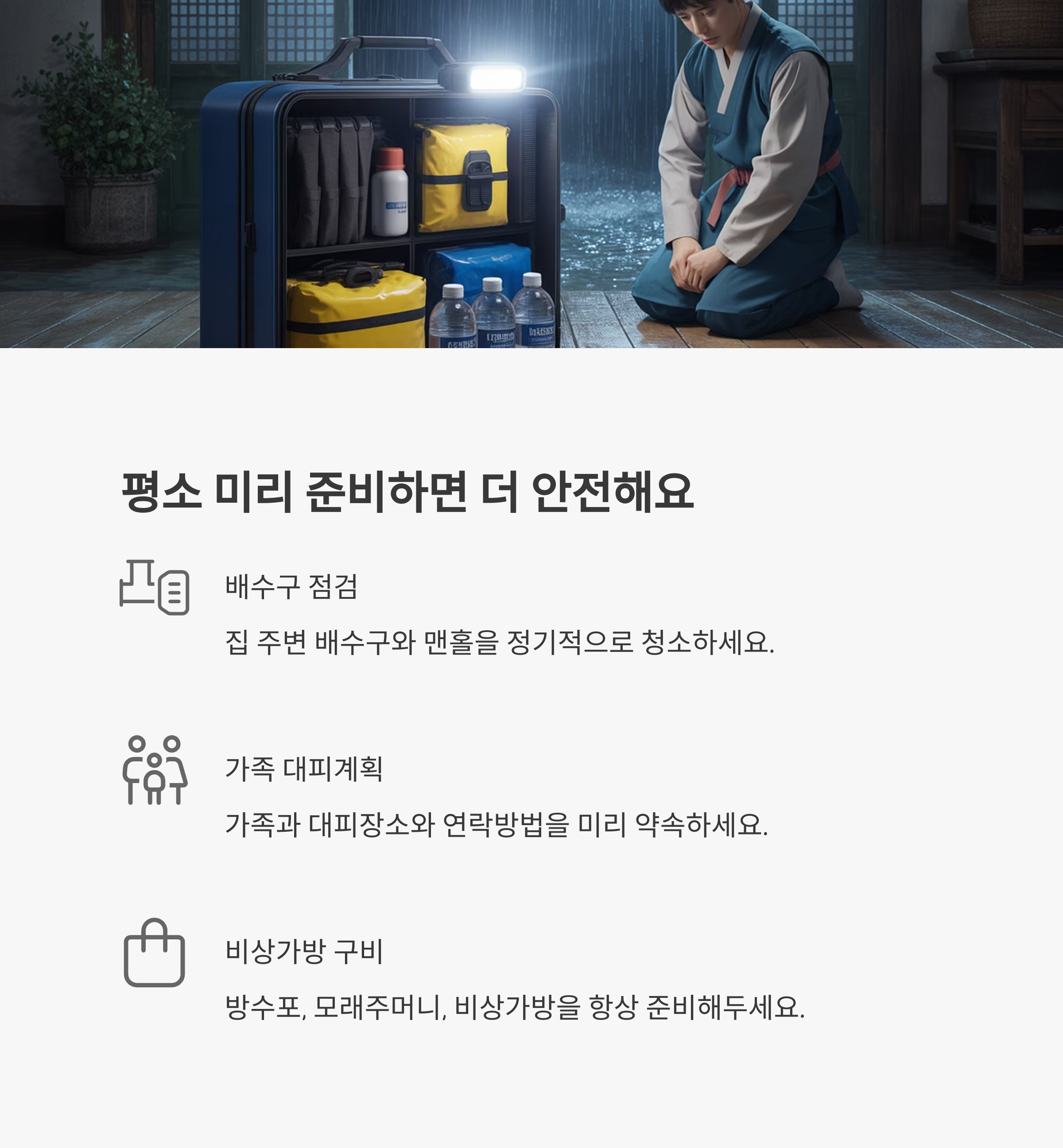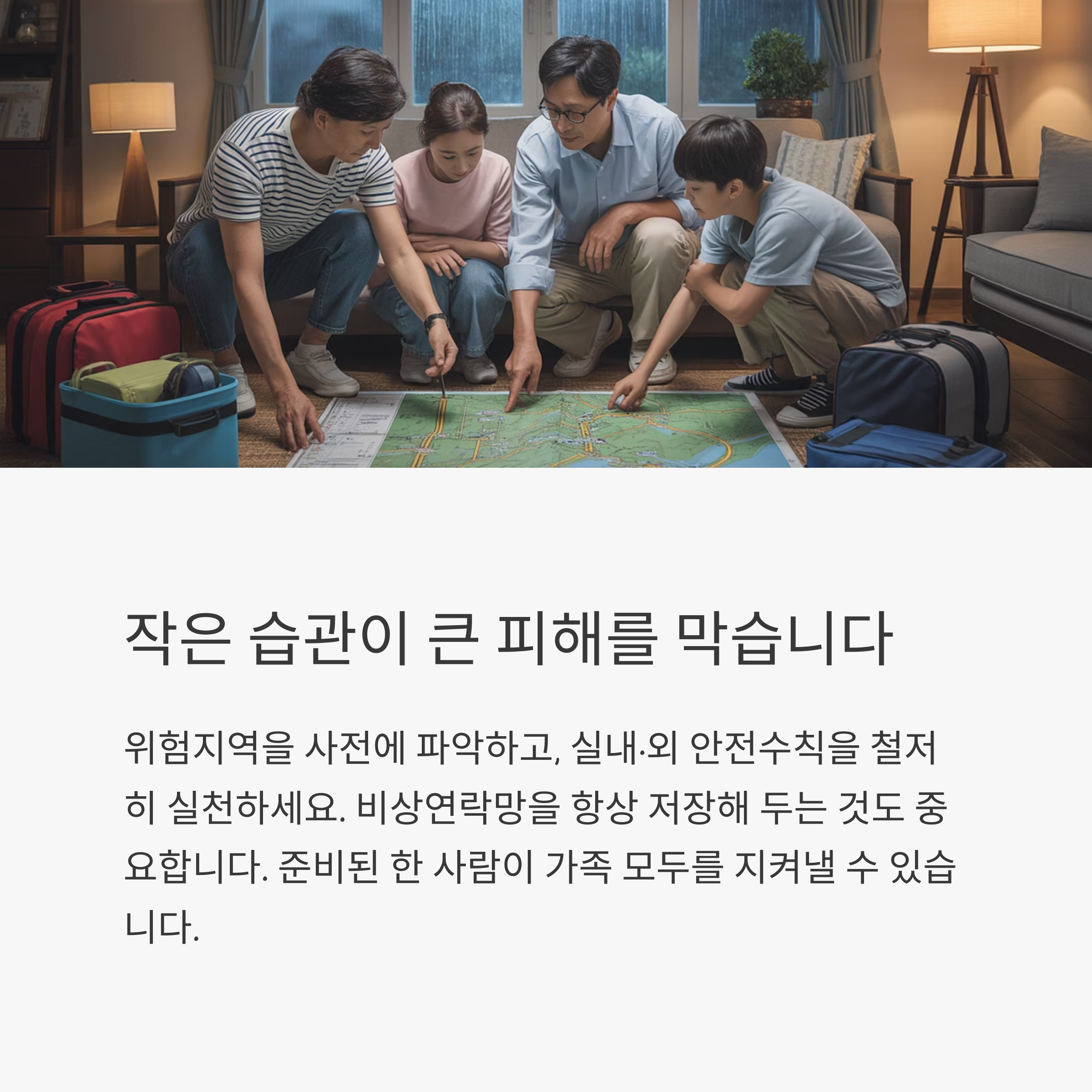 여름철, 특히 장마철이 되면 언제든지 발생할 수 있는 집중호우. 오늘부터라도 하나하나 점검하며 안전을 준비해 보세요. 작은 준비가 큰 차이를 만든다는 점을 잊지 마시기 바랍니다.