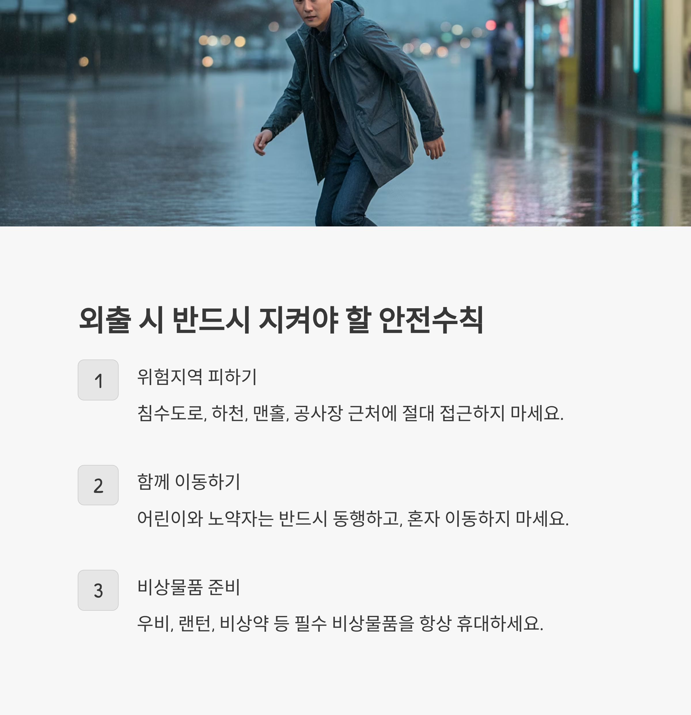 호우주의보가 발령된 날은 가급적 외출을 삼가는 것이 안전합니다. 하지만 불가피하게 외출을 해야 할 경우, 반드시 아래의 사항을 기억하세요.