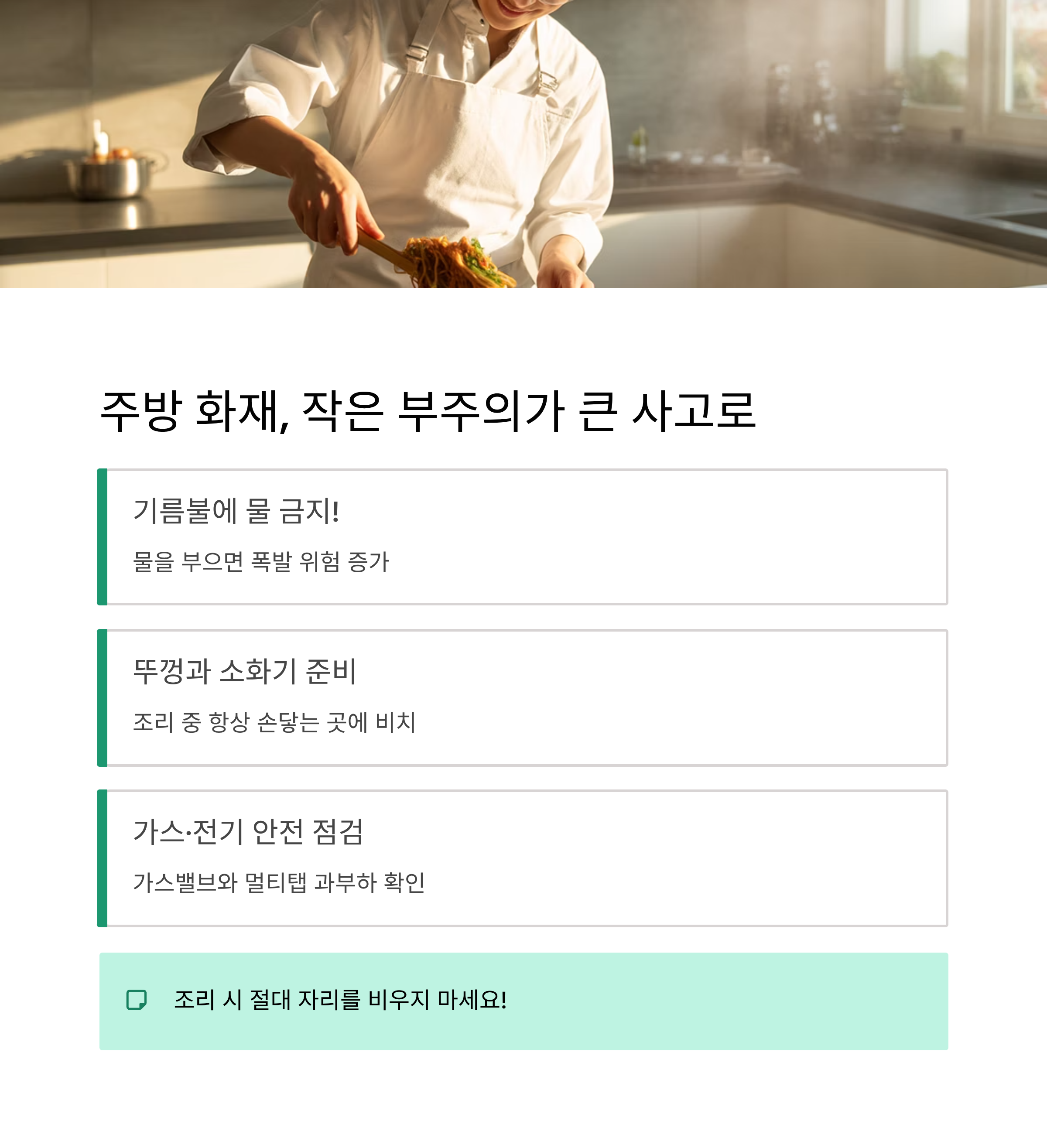 - 주방: 자리 비움 금지·소화기 구비·기름 화재 대응 숙지