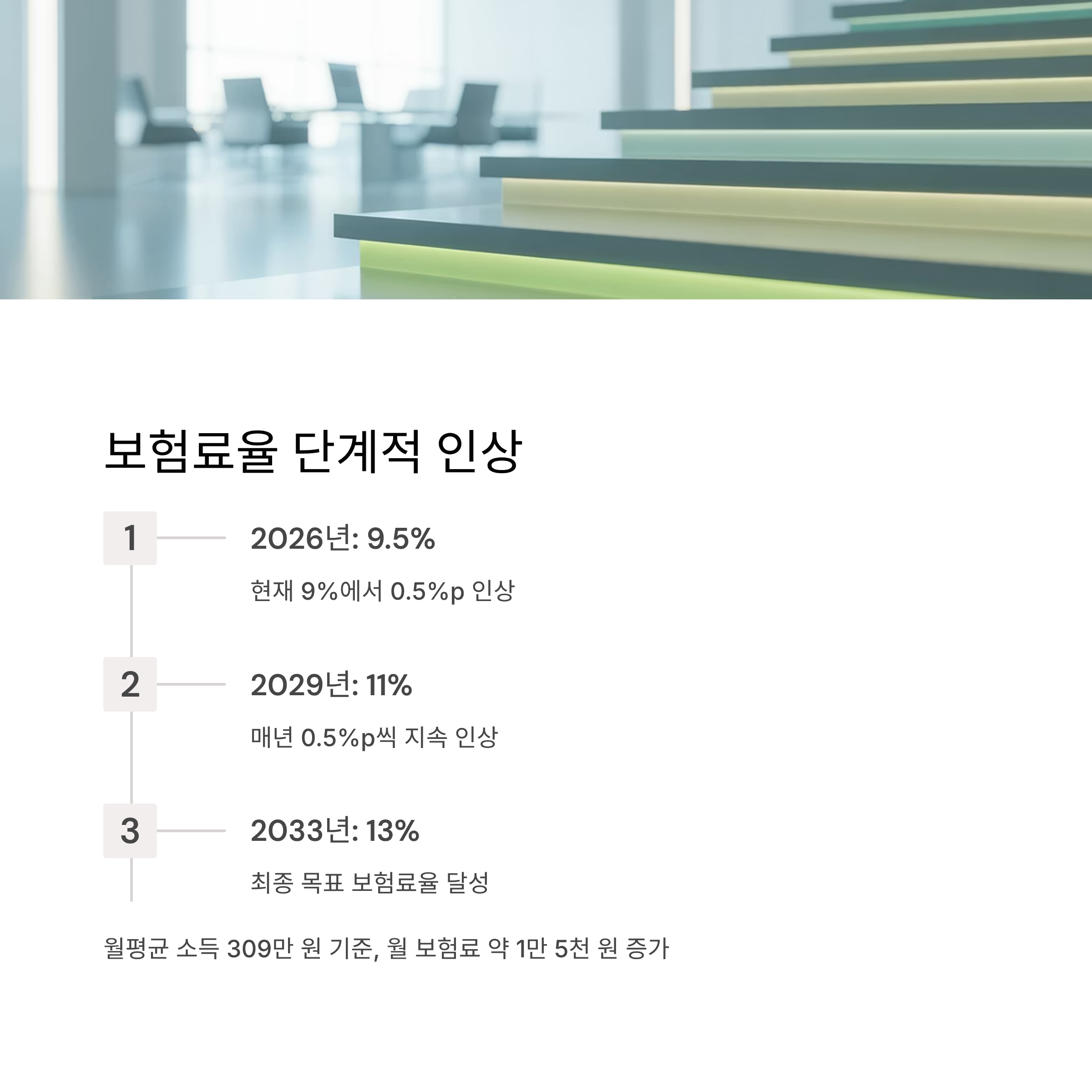 현재 국민연금 보험료율은 9%입니다. 예를 들어 월 소득 300만 원이라면 27만 원을 내는 구조입니다. 그러나 2026년부터 매년 0.5%포인트씩 단계적으로 인상되어 2033년에는 13%까지 올라갑니다. 즉 같은 소득이라면 39만 원을 내게 되는 셈입니다.