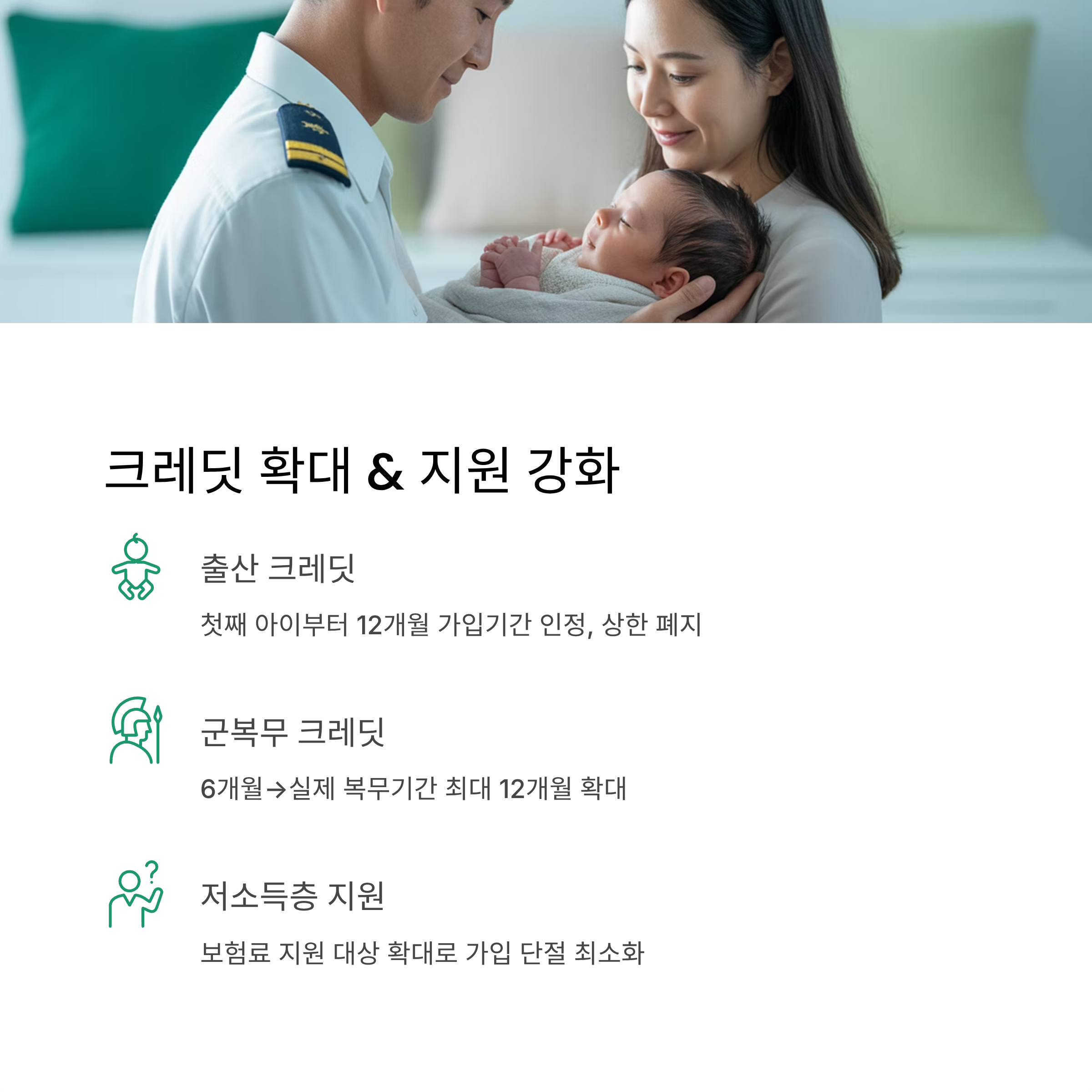 - 군복무 크레딧 : 현행 최대 6개월 인정 → 12개월까지 확대. 실제 무급 가입 기간으로 인정됩니다.